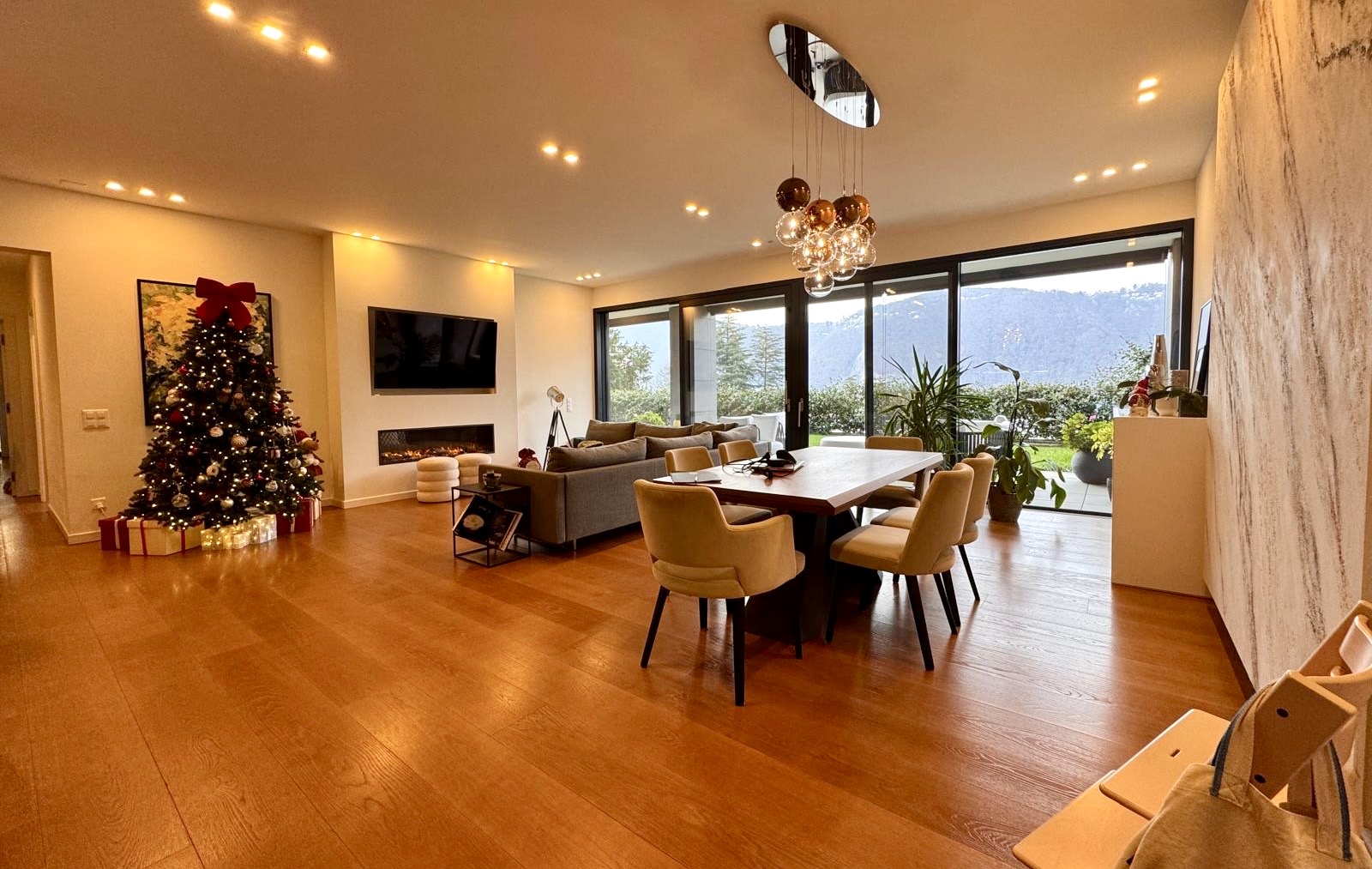 Located in the strategic Bissone, a few minutes from the center of Lugano, residential complex with open lake view that also gives a high level of privacy. We offer for sale a 5.5-room apartment with large garden terrace. You enter on the living area, served by air conditioning, with large and bright living room and open space kitchen. Direct access to the 62sqm garden terrace with covered porch. The long corridor develops the sleeping area with four bedrooms, three bathrooms and a third room used as laundry. The master bedroom is served, in addition to its en suite bathroom, by walk-in closet with mirrored doors. Three garage spaces and a 50-sqm cellar, located on the same floor as the apartment, complete the property.