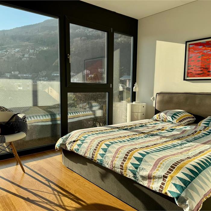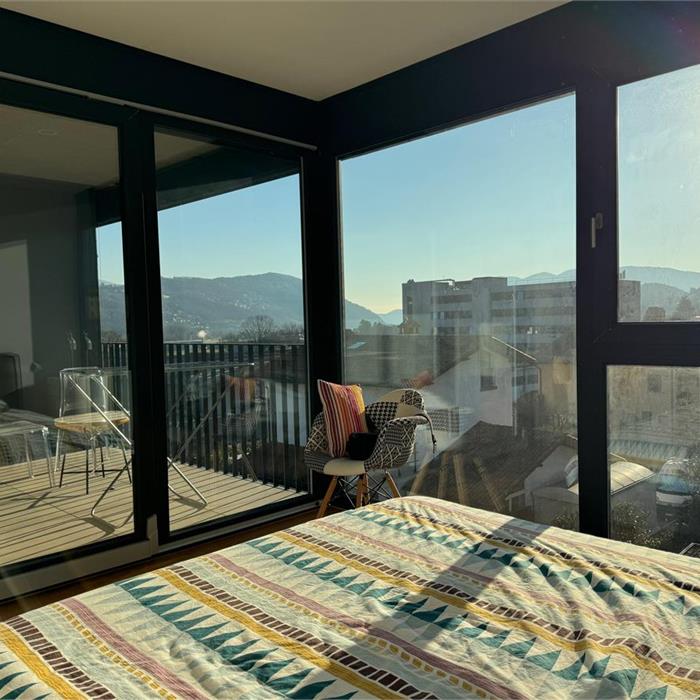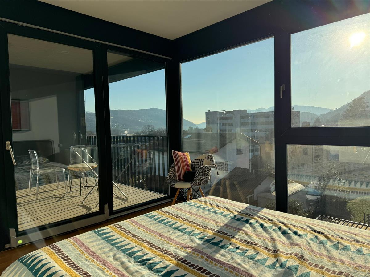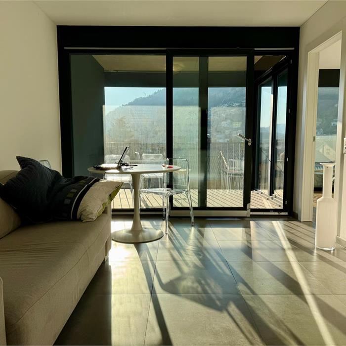 Agno. Quiet area and served a stone's throw from the station. In a new building surrounded with shared garden, we offer a nice 2.5 furnished and equipped. The apartment is located on the second and last floor and consists of an entrance hall, an open space kitchen and a large living room that overlooks an external terrace with an open view of the Serocca d'Agno nucleus; bedroom, bathroom with shower and washer dryer. The property includes a cellar and a covered outdoor parking space. An elegant Japanese garden inside the courtyard embellishes the building. Price CHF 1'450 Expenses CHF 150
