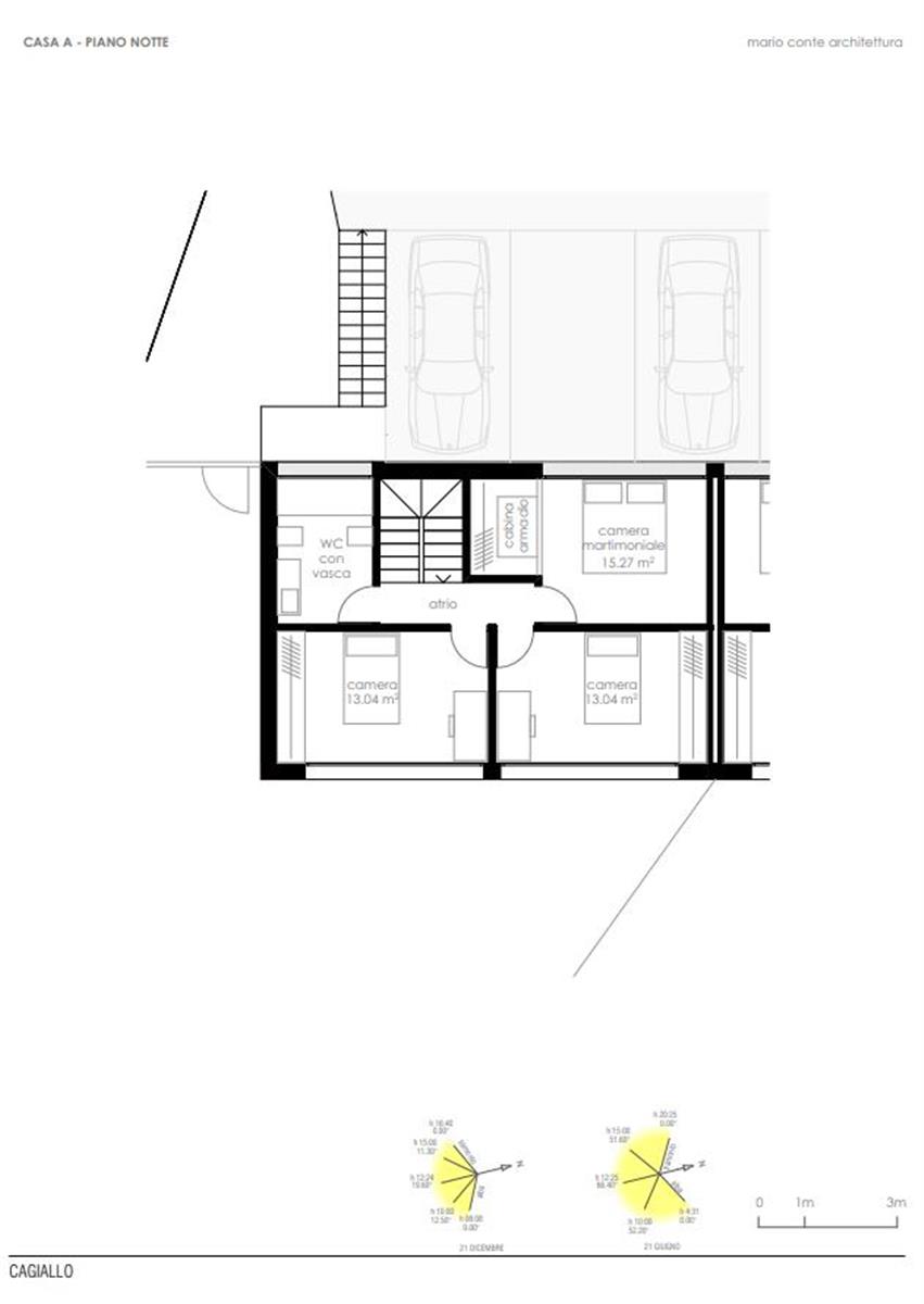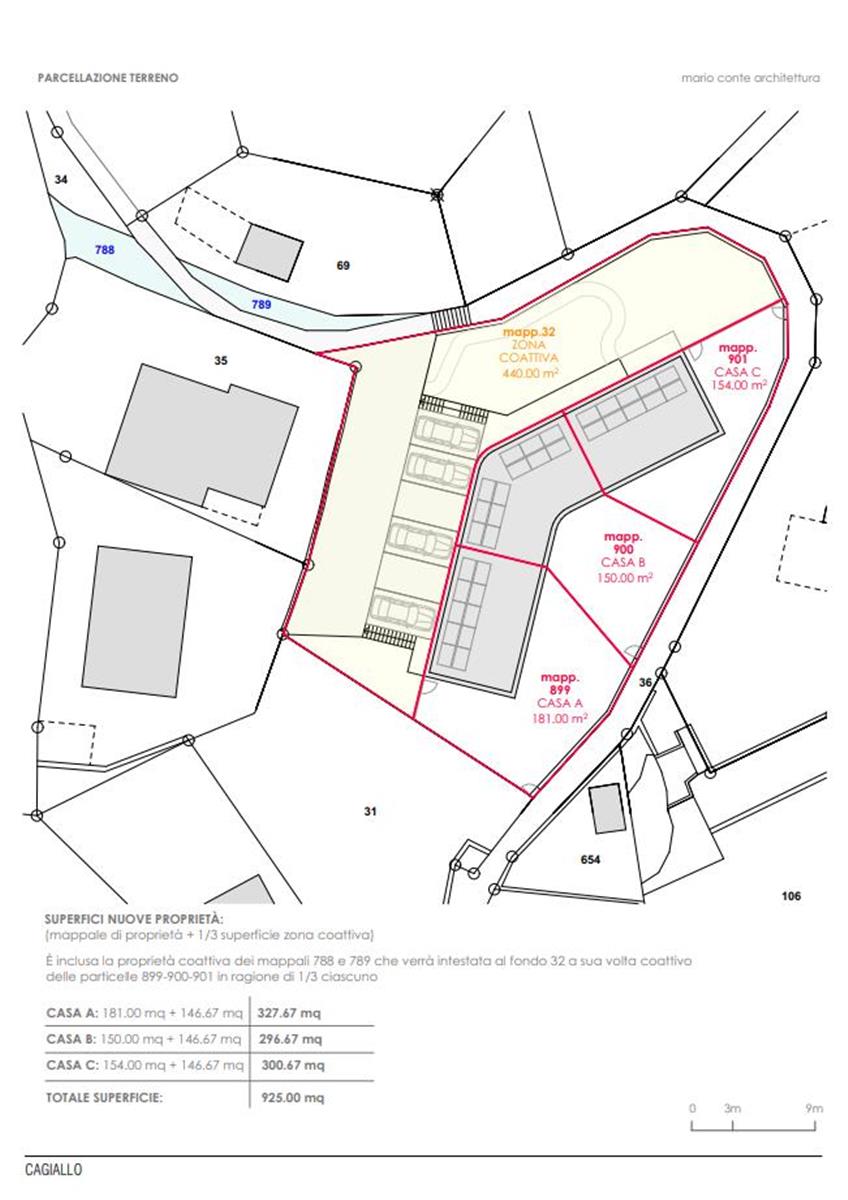 The land covered by the project is located above the historic centre of Cagiallo, now part of the municipality of Capriasca. The area is quiet, green and away from traffic, with an open view towards both the historic centre and the ‘Denti della Vecchia’ mountain range. The land also benefits from a convenient public footpath, accessible directly from the site, which connects the centre of Cagiallo to the valley. The project involves the construction of three new detached single-family homes, which are modern and enjoy excellent sunshine all year round thanks to the orientation designed by the architect. Each home has three levels: an open-plan living area with large windows facing the valley, a sleeping area with three bedrooms and two bathrooms, and a garden level with a covered porch, laundry room, utility room and cellar. Each unit has a private garden, independent pedestrian access and two parking spaces. On the upper level, there is a communal “organic vegetable garden” area for the three homes, while under the parking spaces there is a covered area with private cupboards and the external units of the heat pumps, completely hidden from view. The homes are designed with sustainability in mind: independent photovoltaic systems, separate air-water heat pumps for each home, insulated windows, motorised sunshades and underfloor heating in all living areas. House 2 is currently reserved, while the other two units are available.