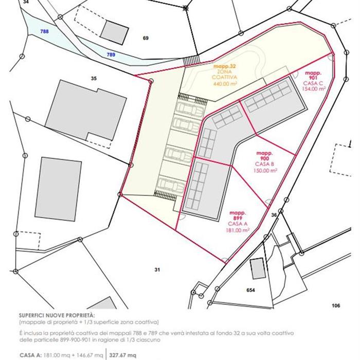 The land covered by the project is located above the historic centre of Cagiallo, now part of the municipality of Capriasca. The area is quiet, green and away from traffic, with an open view towards both the historic centre and the ‘Denti della Vecchia’ mountain range. The land also benefits from a convenient public footpath, accessible directly from the site, which connects the centre of Cagiallo to the valley. The project involves the construction of three new detached single-family homes, which are modern and enjoy excellent sunshine all year round thanks to the orientation designed by the architect. Each home has three levels: an open-plan living area with large windows facing the valley, a sleeping area with three bedrooms and two bathrooms, and a garden level with a covered porch, laundry room, utility room and cellar. Each unit has a private garden, independent pedestrian access and two parking spaces. On the upper level, there is a communal “organic vegetable garden” area for the three homes, while under the parking spaces there is a covered area with private cupboards and the external units of the heat pumps, completely hidden from view. The homes are designed with sustainability in mind: independent photovoltaic systems, separate air-water heat pumps for each home, insulated windows, motorised sunshades and underfloor heating in all living areas. House 2 is currently reserved, while the other two units are available.