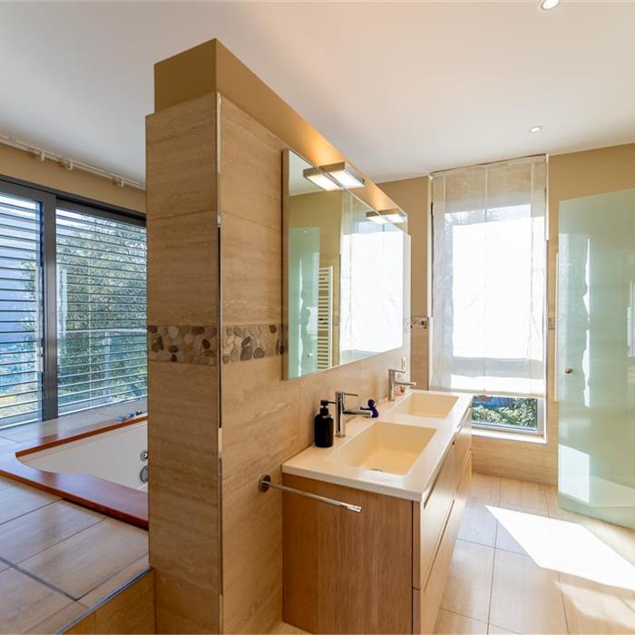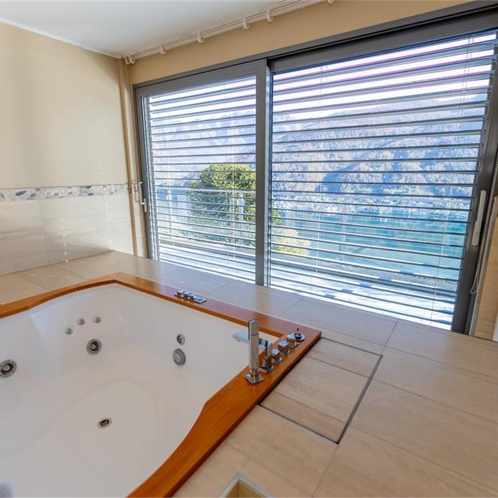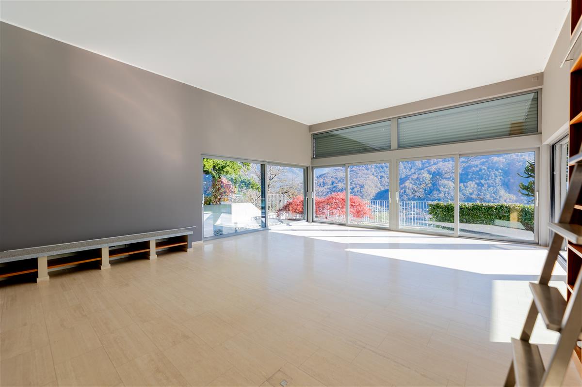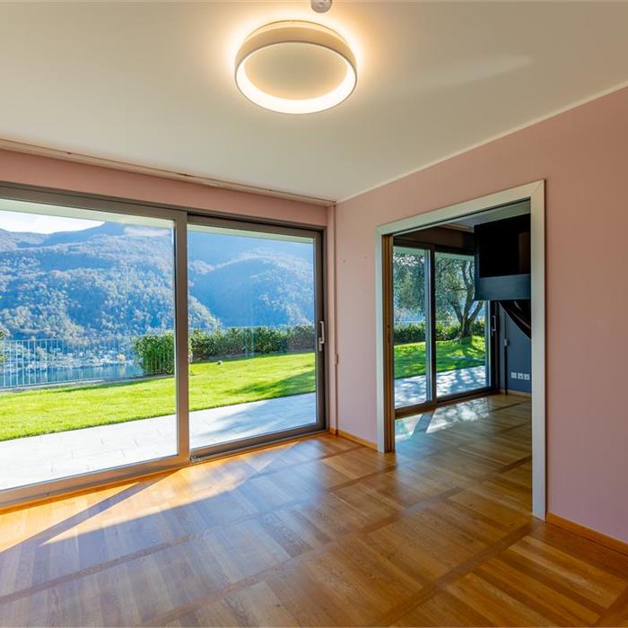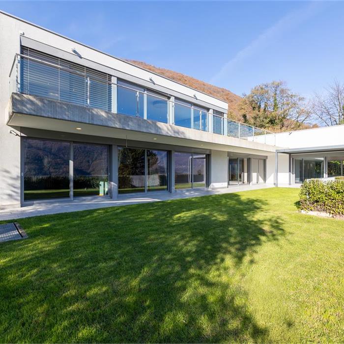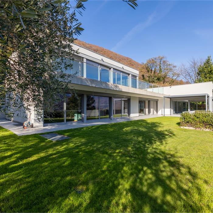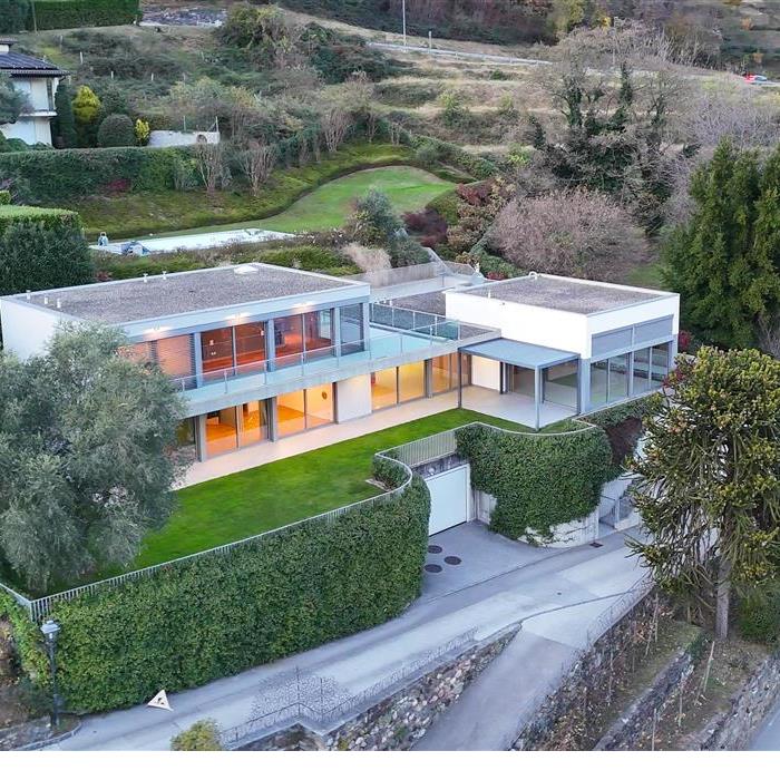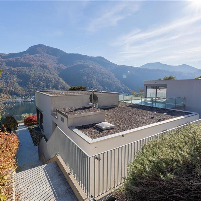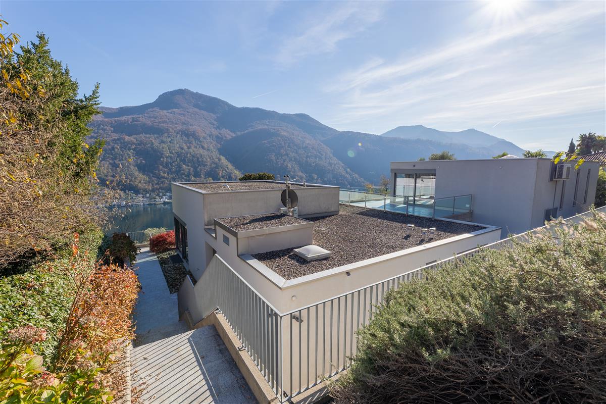 Vico Morcote. In posizione esclusiva, proponiamo in vendita elegante villa di architettura moderna con vista lago, grande giardino e piscina. Costruita nel 2009, sorge su un terreno di 1670/mq. L'accesso all'abitazione avviene da un camminamento pedonale o dall'autorimessa dove è possibile parcheggiare fino a 8 macchine. Allo stesso livello si trovano due ampi locali hobby riscaldati di cui uno con bagno e doccia, un'ampia cantina ed una comoda lavanderia. Al piano superiore si trova la zona living, con ampio ingresso, elegante soggiorno con soffitti alti fino a 5m e grandi vetrate affacciate sul lago e sul giardino. La cucina ampia e abitabile e la sala da pranzo si aprono sul giardino. Allo stesso livello si trova una prima zona notte con due camere da letto servite da un bagno e una cabina armadio e una terza camera ospiti con bagno en suite e guardaroba. La suite padronale di circa 100 mq è al piano primo e dispone di una terrazza vista lago, una zona studio, un'ampia cabina armadio ed un bagno con vasca idromassaggio. Nella parte alta del giardino, con prato all'inglese pianeggiante con privacy e vista lago, si trova la piscina. La proprietà viene venduta con una licenza per costruire un'altra villa di 400 mq di SUL nella parte di giardino sul retro. Privacy, eleganza e cura dei dettagli rendono questa proprietà unica. Richiesta: CHF 8'000'000