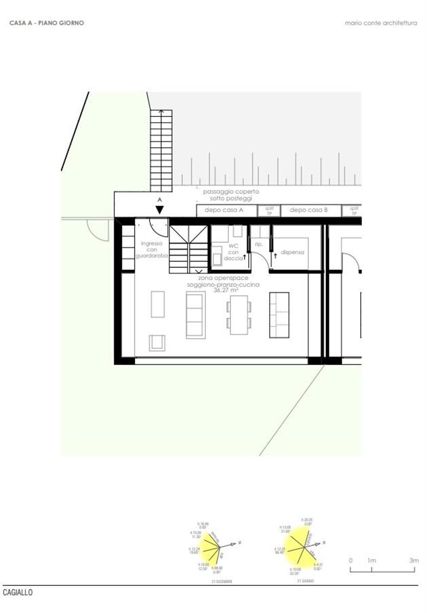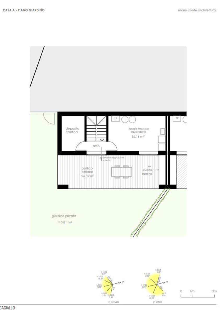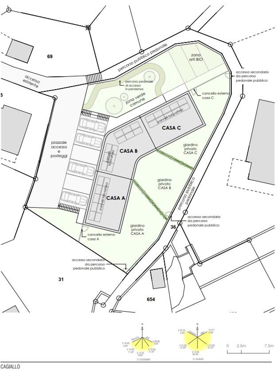 The land covered by the project is located above the historic centre of Cagiallo, now part of the municipality of Capriasca. The area is quiet, green and away from traffic, with an open view towards both the historic centre and the ‘Denti della Vecchia’ mountain range. The land also benefits from a convenient public footpath, accessible directly from the site, which connects the centre of Cagiallo to the valley. The project involves the construction of three new detached single-family homes, which are modern and enjoy excellent sunshine all year round thanks to the orientation designed by the architect. Each home has three levels: an open-plan living area with large windows facing the valley, a sleeping area with three bedrooms and two bathrooms, and a garden level with a covered porch, laundry room, utility room and cellar. Each unit has a private garden, independent pedestrian access and two parking spaces. On the upper level, there is a communal “organic vegetable garden” area for the three homes, while under the parking spaces there is a covered area with private cupboards and the external units of the heat pumps, completely hidden from view. The homes are designed with sustainability in mind: independent photovoltaic systems, separate air-water heat pumps for each home, insulated windows, motorised sunshades and underfloor heating in all living areas. House 2 is currently reserved, while the other two units are available.