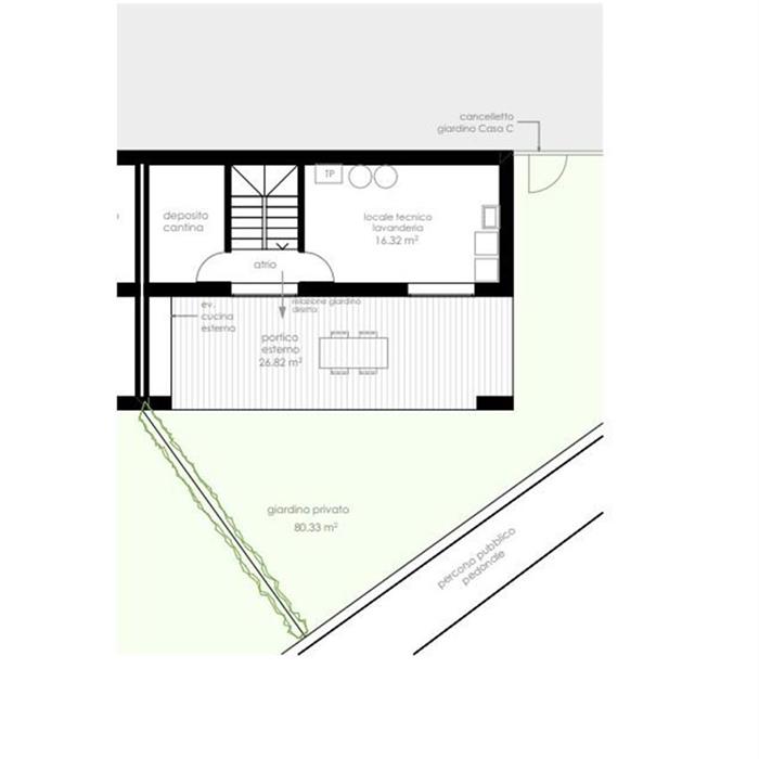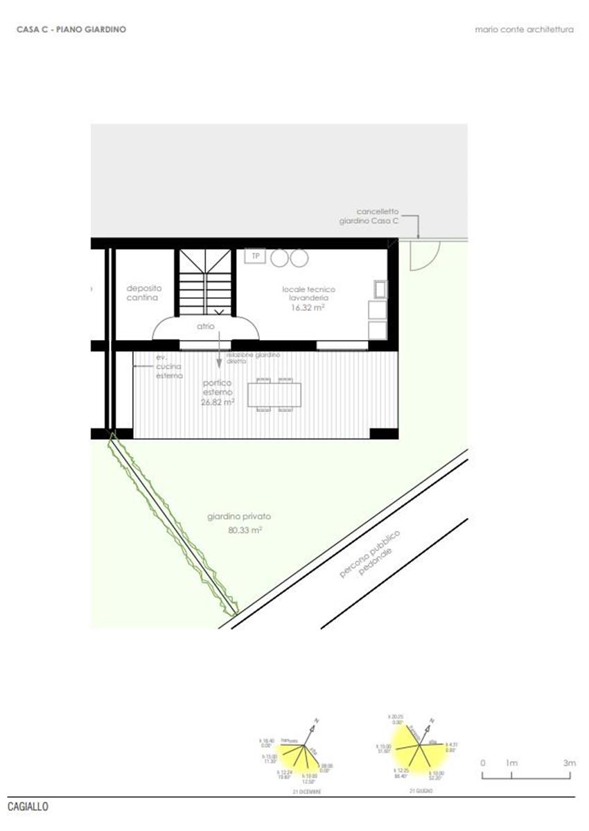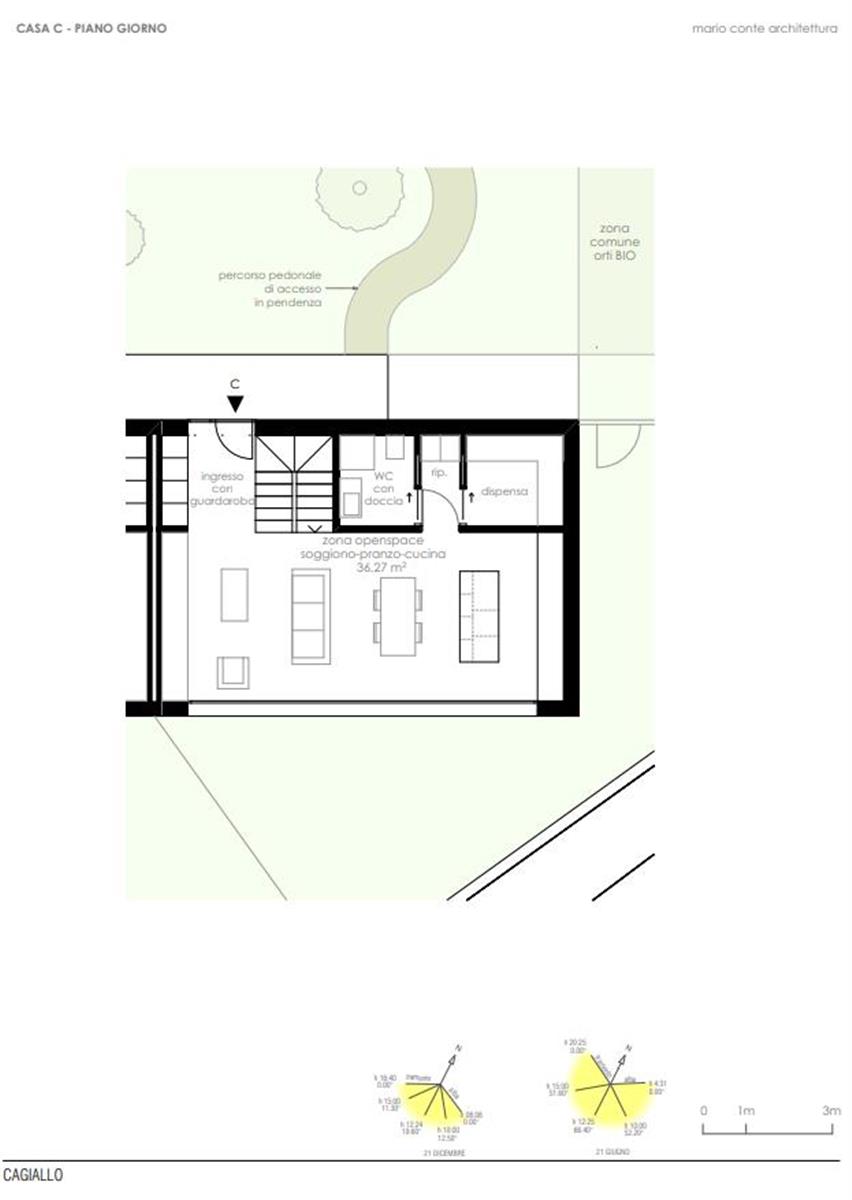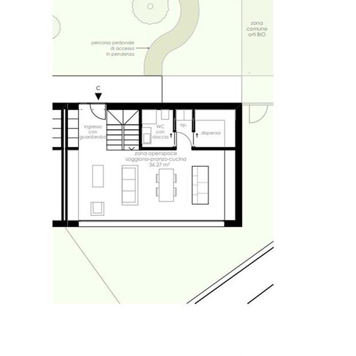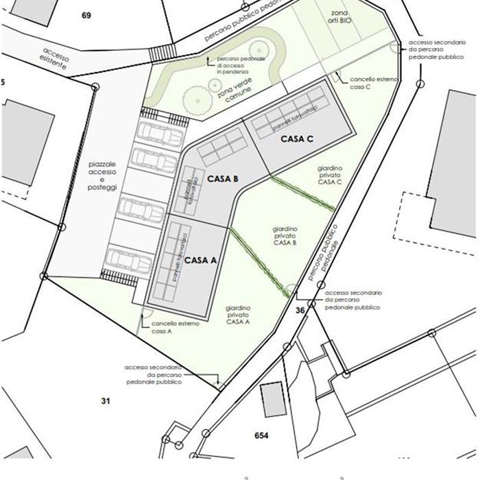 The land covered by the project is located above the historic centre of Cagiallo, now part of the municipality of Capriasca. The area is quiet, green and away from traffic, with an open view towards both the historic centre and the ‘Denti della Vecchia’ mountain range. The land also benefits from a convenient public footpath, accessible directly from the site, which connects the centre of Cagiallo to the valley. The project involves the construction of three new detached single-family homes, which are modern and enjoy excellent sunshine all year round thanks to the orientation designed by the architect. Each home has three levels: an open-plan living area with large windows facing the valley, a sleeping area with three bedrooms and two bathrooms, and a garden level with a covered porch, laundry room, utility room and cellar. Each unit has a private garden, independent pedestrian access and two parking spaces. On the upper level, there is a communal “organic vegetable garden” area for the three homes, while under the parking spaces there is a covered area with private cupboards and the external units of the heat pumps, completely hidden from view. The homes are designed with sustainability in mind: independent photovoltaic systems, separate air-water heat pumps for each home, insulated windows, motorised sunshades and underfloor heating in all living areas. House 2 is currently reserved, while the other two units are available.