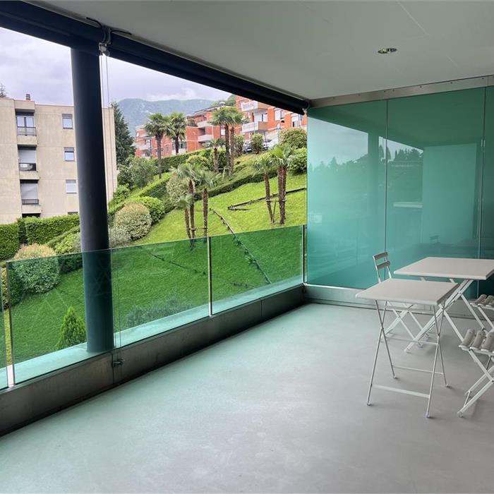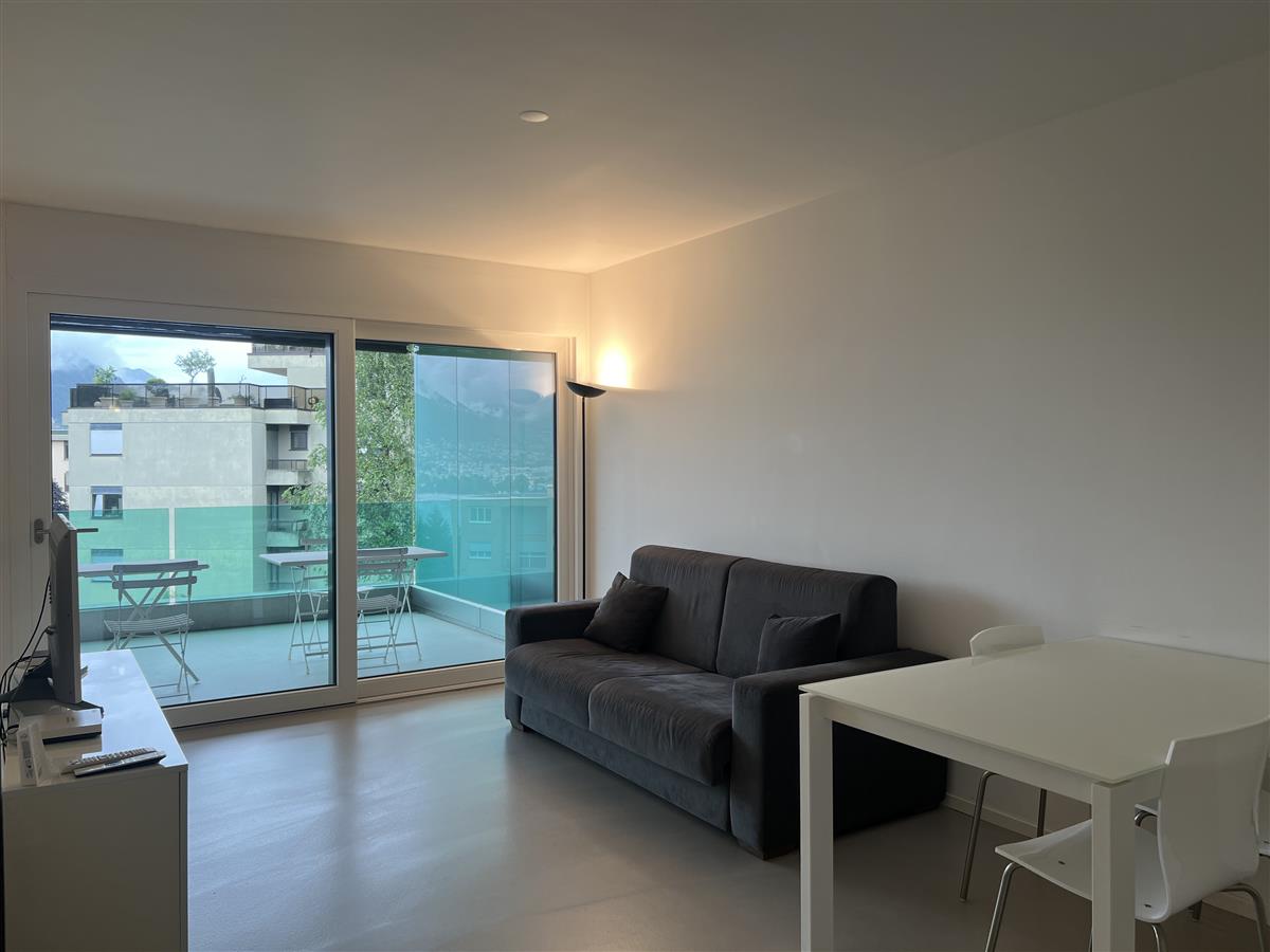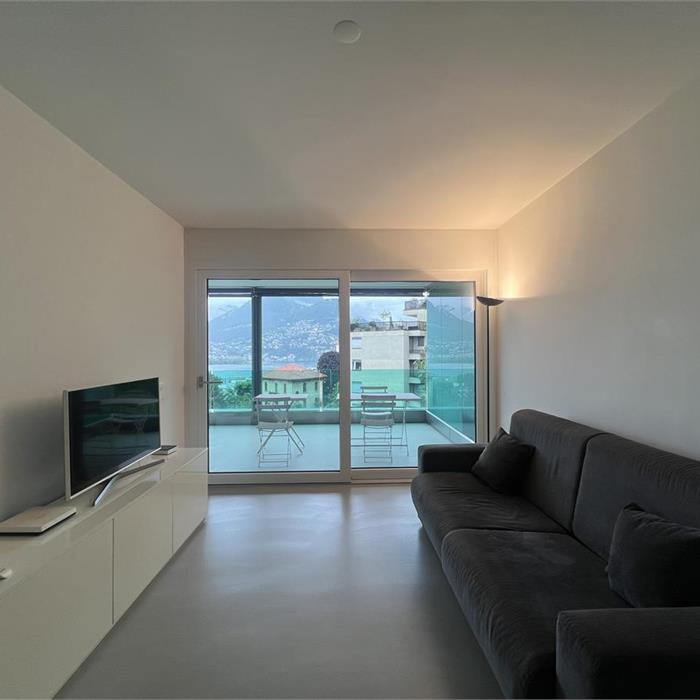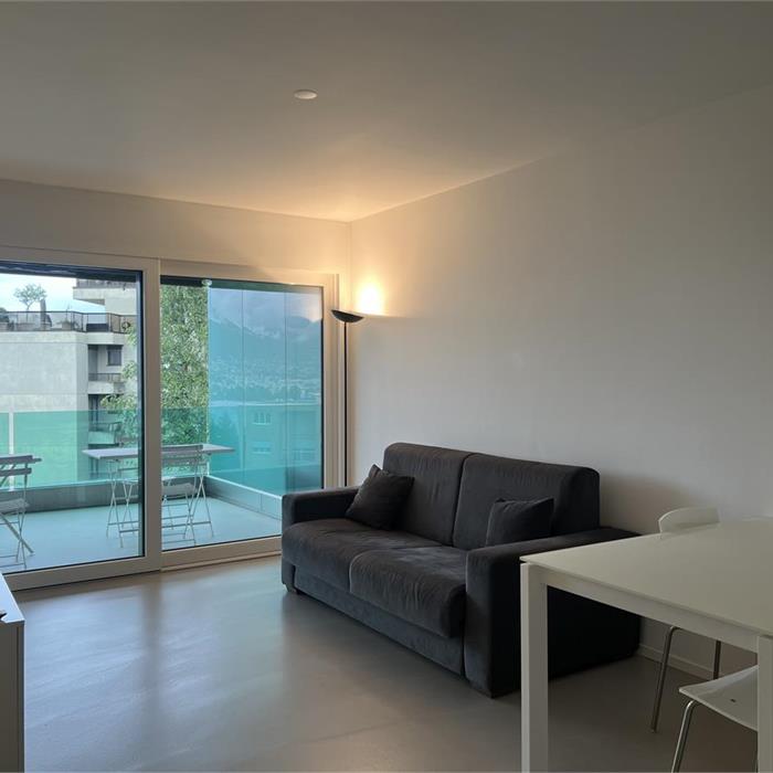 In a newly built residence we offer a splendid, fully furnished 2.5-room flat with high-standard fittings, large terrace and lake view. Available for max. 10 months. The flat is composed as follows: entrance with fitted wardrobes, living area consisting of open-plan kitchen on the living room and large terrace with lake view, double bedroom with fitted wardrobes, modern bathroom with tub/shower. To complete the flat private laundry room on the floor, cellar and parking space in the garage. Request: CHF 1700 (INCLUDING parking space + condo expenses) REF.1343