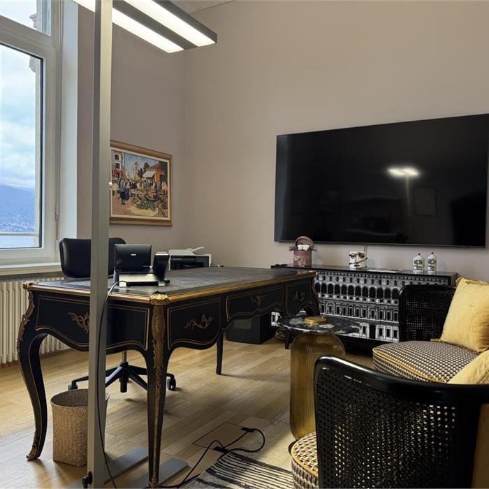 Lugano. In posizione centrale ricerchiamo un subentrante per elegante ufficio di rappresentanza con vista lago. Sito al quinto piano di uno stabile di pregio nel cuore della zona pedonale di Lugano, è composto da 4.5 locali + locali archivio per un totale di 346 mq. Completano la proprietà servizi e doppia area ristoro. Finiture moderne, comfort, privacy e posizione strategica lo rendono una soluzione perfetta per chi sta cercando un ufficio di alto standing in centro città. Lo spazio è assoggettato IVA. Pagamento trimestrale della pigione. Richiesta: affitto netto CHF 9730 (IVA escl.) + CHF 270 (IVA escl.)